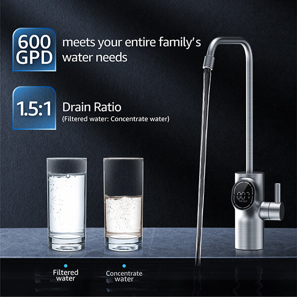 Whether you are looking for healthier, tastier drinking water or cleaner cooking/cleaning water, this reverse osmosis filter is a perfect fit. It is designed to produce over 600 gallons per day of cleaner, safer drinking water perfect for everything from coffee and tea to cooking and cleaning. The low 1.5:1 drain ratio also means it uses less than half the wastewater of traditional filtration systems--so not only will you save on your water bill, but you'll be helping Mother Earth too.
