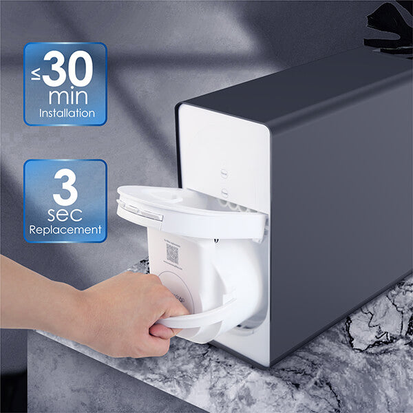 The D6 system is designed for DIY installation within 30 minutes. The push-in replacement design allows you to replace the reverse osmosis filter in 3 seconds without moving the system or using any tools. Now that's convenient. Please note this system needs to be plugged into an electrical outlet. It is not recommended to connect to the refrigerator, nor is it is not recommended for using well water as source.
